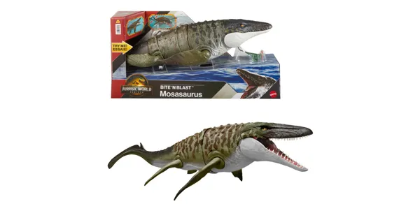 Mattel Jurassic World Die Wiedergeburt - Bite N Blast Mosasaurus Actionfigur und Mini-Dilophosaurus, Dinosaurier-Spielzeug mit breitem Kiefer, filmgetreues und bewegliches Design, digitaler SpielspassMit dieser Mosasaurus-Actionfigur mit „Biss und Attacke-Funktion und einzigartigem Design können Fans die Spannung von Jurassic World: Die Wiedergeburt zu Hause erleben. Die per Knopfdruck ausgelöste Beissfunktion ermöglicht das Nachspielen dramatischer Filmszenen und regt die Kreativität beim Spielen an. Kinder können den Angriff steuern, indem sie den Schwanz halten und auf den Knopf drücken, um das Maul zu öffnen und zuzubeissen. Der enthaltene Mini-Dilophosaurus kann komplett von der grossen Mosasaurus-Figur „verschlungen werden! Einfach erneut den Knopf drücken, um die Beute wieder „auszuwerfen! Mit seinen beweglichen Gelenken und dem filmgetreuen Design ist der ca. 65 cm grosse Mosasaurus perfekt zum Spielen und Ausstellen geeignet. Durch Scannen des Tracking-Codes unter der Flosse in der kostenlosen Jurassic World Play App mit einem kompatiblen Smart-Gerät (Android oder iOS, nicht enthalten) wird eine digitale Version des Dinosauriers sowie ein lustiges Spiel freigeschaltet, bei dem man mit verschiedenen Fahrzeugen an Land, in der Luft und im Wasser Rennen fährt. Tolles Geschenk für Dinosaurier-Fans ab 4 Jahren