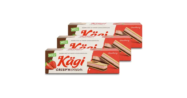 Schweizer Waffelspezialität mit Erdbeercremefüllung (57%) und Schokoladencremefüllung (29% mit 10% dunkler Schokolade) – Zutaten: Palmfett (nachhaltig; zertifiziert), Zucker, VOLLMILCHPULVER, WEIZENMEHL, MAGERMILCHPULVER, Kakaopulver* (2.6%), Erdbeerfruchtpulver 2.1% (Erdbeeren, Maltodextrin, Säuerungsmittel: Zitronensäure), Kakaomasse* (1.4%), Kakaobutter*, natürliche Aromen, Emulgator: Lecithine (SOJA), gemahlene WEIZENFASERN, BUTTERFETT, EIGELBPULVER, Säuerungsmittel: Zitronensäure, Kochsalz, Backtriebmittel: Natriumhydrogencarbonat. Kann Spuren von HASELNÜSSEN enthalten. *Rainforest Alliance Certified. Zutaten: Palmfett (nachhaltig; zertifiziert), Zucker, VOLLMILCHPULVER, WEIZENMEHL, MAGERMILCHPULVER, Kakaopulver* (2.6%), Erdbeerfruchtpulver 2.1% (Erdbeeren, Maltodextrin, Säuerungsmittel: Zitronensäure), Kakaomasse* (1.4%), Kakaobutter*, natürliche Aromen, Emulgator: Lecithine (SOJA), gemahlene WEIZENFASERN, BUTTERFETT, EIGELBPULVER, Säuerungsmittel: Zitronensäure, Kochsalz, Backtriebmittel: Natriumhydrogencarbonat. Kann Spuren von HASELNÜSSEN enthalten. *Rainforest Alliance Certified.