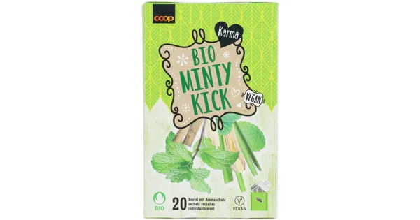 Kräuterteemischung Karma Bio Minty Kick Tee 20 Beutel bietet eine erfrischende Mischung aus biologischem Pfefferminzblatt und fein abgestimmten Kräutern. Die praktische Box enthält 20 Teebeutel für unkomplizierten Teegenuss. Nachhaltig hergestellt, passt dieses Bioprodukt ideal zu einem bewussten Lebensstil. – Zutaten: Grüne Minze, Pfefferminze, Zitronengras, Süssholz. Alle landwirtschaftlichen Zutaten stammen aus biologischer Produktion. Zutaten: Grüne Minze, Pfefferminze, Zitronengras, Süssholz. Alle landwirtschaftlichen Zutaten stammen aus biologischer Produktion.