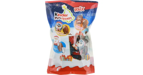 Gefüllte Vollmilchschokolade mit Milchfüllung (55 %). Gefüllte Vollmilchschokolade mit Milchfüllung (49,5 %) und Kakaokeksgranulat (5,5 %). Gefüllte Vollmilchschokolade mit Milchfüllung (49 %) und Keksgranulat (5,5 %) mit Karamellgeschmack – Zutaten: KINDER MINI FRIENDS MILCH: Zutaten: VOLLMILCHSCHOKOLADE 45 % (Zucker, VOLLMILCHPULVER, Kakaobutter, Kakaomasse, Emulgator Lecithine(SOJA), Vanillin), Zucker, MAGERMILCHPULVER (16,5 %), Palmöl, BUTTERREINFETT, Emulgator Lecithine (SOJA), Vanillin. Gesamtmilchbestandteile im Produkt 32 %. Gesamtkakaobestandteile im Produkt 14,5 %. Kann HASELNÜSSE enthalten. KINDER MINI FRIENDS KNUSPERKEKS: Zutaten: VOLLMILCHSCHOKOLADE 45% (Zucker, VOLLMILCHPULVER, Kakaobutter, Kakaomasse, Emulgator Lecithine (SOJA), Vanillin), Zucker, MAGERMILCHPULVER (15 %), Palmöl, BUTTERREINFETT, Maisstärke, Kakao (0,4 %), Emulgator Lecithine (SOJA), Glukosesirup, Backtriebmittel Ammoniumhydrogencarbonat, Vanillin. Gesamtmilchbestandteile im Produkt: 30 %. Gesamtkakaobestandteile im Produkt: 15 %. Kann HASELNÜSSE enthalten. KINDER MINI FRIENDS KNUSPERKEKS MIT KARAMELLGESCHMACK: Zutaten: VOLLMILCHSCHOKOLADE 45 % (Zucker, VOLLMILCHPULVER,Kakaobutter, Kakaomasse, Emulgator Lecithine (SOJA), Vanillin), Zucker, MAGERMILCHPULVER (14,5 %), Palmöl, BUTTERREINFETT, Maisstärke, BUTTER, Reismehl, karamellisierter Zucker (0,2 %), SAHNEPULVER, Emulgator Lecithine (SOJA), Aromen, Backtriebmittel Natriumhydrogencarbonat, Salz. Gesamtmilchbestandteile im Produkt 30 %. Kann HASELNÜSSE enthalten. Zutaten: KINDER MINI FRIENDS MILCH: Zutaten: VOLLMILCHSCHOKOLADE 45 % (Zucker, VOLLMILCHPULVER, Kakaobutter, Kakaomasse, Emulgator Lecithine(SOJA), Vanillin), Zucker, MAGERMILCHPULVER (16,5 %), Palmöl, BUTTERREINFETT, Emulgator Lecithine (SOJA), Vanillin. Gesamtmilchbestandteile im Produkt 32 %. Gesamtkakaobestandteile im Produkt 14,5 %. Kann HASELNÜSSE enthalten. KINDER MINI FRIENDS KNUSPERKEKS: Zutaten: VOLLMILCHSCHOKOLADE 45% (Zucker, VOLLMILCHPULVER, Kakaobutter, Kakaomasse, Emulgator Lecithine (SOJA), Vanillin), Zucker, MAGERMILCHPULVER (15 %), Palmöl, BUTTERREINFETT, Maisstärke, Kakao (0,4 %), Emulgator Lecithine (SOJA), Glukosesirup, Backtriebmittel Ammoniumhydrogencarbonat, Vanillin. Gesamtmilchbestandteile im Produkt: 30 %. Gesamtkakaobestandteile im Produkt: 15 %. Kann HASELNÜSSE enthalten. KINDER MINI FRIENDS KNUSPERKEKS MIT KARAMELLGESCHMACK: Zutaten: VOLLMILCHSCHOKOLADE 45 % (Zucker, VOLLMILCHPULVER,Kakaobutter, Kakaomasse, Emulgator Lecithine (SOJA), Vanillin), Zucker, MAGERMILCHPULVER (14,5 %), Palmöl, BUTTERREINFETT, Maisstärke, BUTTER, Reismehl, karamellisierter Zucker (0,2 %), SAHNEPULVER, Emulgator Lecithine (SOJA), Aromen, Backtriebmittel Natriumhydrogencarbonat, Salz. Gesamtmilchbestandteile im Produkt 30 %. Kann HASELNÜSSE enthalten.