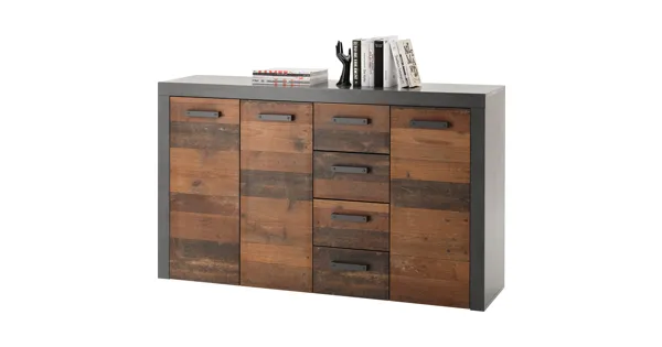Die Kommode India gehört zur gleichnamigen Möbelserie, welche im angesagten Industrial Design gestaltet ist. Das trendige Möbelstück ist vielseitig einsetzbar und bietet eine Menge Stauraum. In den vier Schubladen und hinter den drei Türen lassen sich unterschiedliche Utensilien ordentlich verstauen. Das lässige Sideboard kann mit weiteren Möbeln aus der Serie India kombiniert werden und so im Wohnbereich, Schlafzimmer, Ankleide oder Eingang seinen Platz finden. Die extravagante Gestaltung aus anthrazitfarbenem Korpus und Fronten aus Dekor Old Wood macht die Kommode zu einem Blickfang, egal in welchem Raum sie platziert wird.