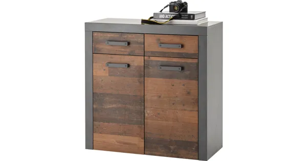 Die Kommode India aus der gleichnamigen Möbelserie überzeugt mit ihrem angesagten Industrial Design und ihrer funktionalen Gestaltung. Die Kombination aus anthrazitfarbenem Korpus und Fronten aus Dekor Old Wood macht das Möbelstück zu einem besonderen Hingucker. Der etwas rustikale Look bringt eine Vielzahl Gestaltungsmöglichkeiten mit sich und kann zu unterschiedlichen Einrichtungsstilen kombiniert werden. Die zwei Schubladen und das Ablagefach hinter zwei Türen bieten reichlich Stauraum. Das schmale Sideboard kann im Wohnbereich, im Eingang oder im Schlafzimmer seinen Platz finden.