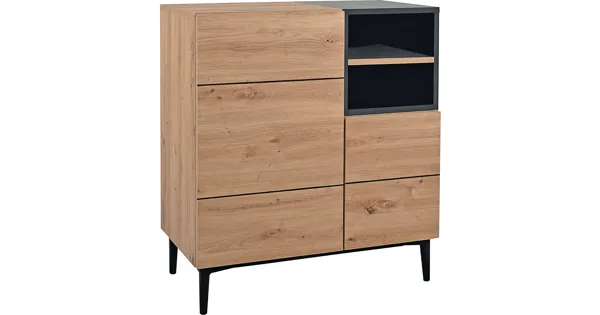Unsere Kommode Joe überzeugt mit seinem stilvollen und zeitlosen Design. Das hohe Sideboard mit Holzdekor und dunklen Akzenten kann zum Beispiel im Schlafzimmer als Wäschekommode, im Wohnzimmer zur Aufbewahrung von Geschirr oder im Eingangsbereich zum ordentlichen Verstauen von Schuhen und Accessoires genutzt werden. Das Möbel bietet zudem die perfekte Fläche für Wohnaccessoires und Blumen. Kombiniere weitere Möbelstücke aus der Serie Joe und schaffe ein einheitliches Interieur.