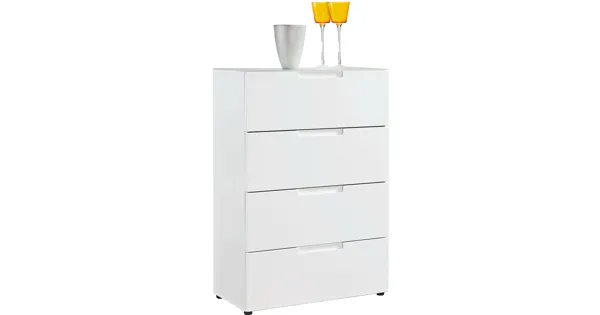 Die Kommode Mailand wirkt mit ihrer Front aus Hochglanz hochwertig und nobel. Das Korpus ist in Weiss gehalten und die Fläche oben ist mit einer Milchglasplatte veredelt. Die dezenten Griffmulden machen den modernen Look komplett. Die Kommode verfügt über vier grosszügige Schubladen, die viel Stauraum bieten. Ein tolles Möbelstück, das sehr dezent ist und doch meisterhaft elegant den Raum schmückt.
