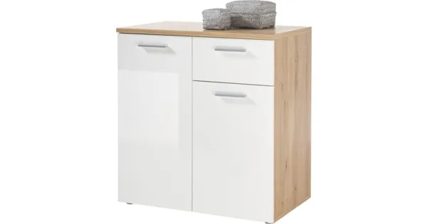 Die Kommode Paul überzeugt durch ihren modernen Look. Paul bietet mit zwei Türen und einer Schublade viel Platz für Ihre Bücher und weitere Accessoires. Die Kombination aus dem Dekor Eiche Artisan und dem Korpus in Hochglanz weiss verleihen Ihrer Wohnung eine gemütliche und wohlfühlende Atmosphäre.