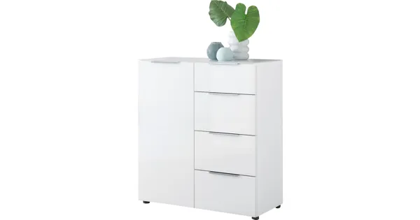 Die elegante Kommode Santo punktet mit ihrem modernen Design in strahlendem Weiss aus Spanplatten und Oberplatten aus Glas. Die verchromten Metallgriffe und die schwarzen Kunststofffüsse verleihen der Kommode das gewisse Etwas. Sie verfügt über eine Tür, vier Schubladen und zwei Einlegeböden – ideal, um Bücher und kleinere Alltagsgegenstände zu verstauen und Ordnung zu schaffen. Zudem gehört das laute Zuschlagen von Türen und Schubladen dank der Soft-Close-Funktion der Vergangenheit an.