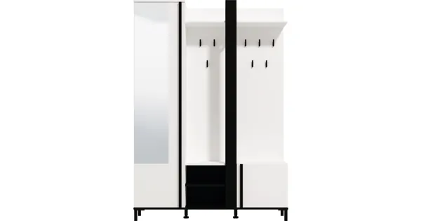 Die 2-türige Kompakt-Garderobe Nino bietet viel Platz zum Verstauen. Sie hat zwei offene Fächer, eine Hutablage, eine Kleiderstange, acht Haken zum Kleider aufhängen sowie einen Spiegel. Durch ihr zeitloses Design in weiss mit schwarzen Akzenten passt sie sich deinem Einrichtungsstil an.