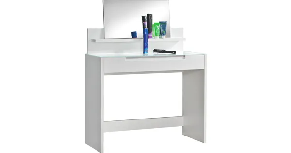 In stilvollem Glanz lässt der Schminktisch Mailand Träume eines jeden Beautyfans wahr werden. Genügend Platz für Parfums, Haarprodukte oder Schminkutensilien bieten Ihnen zwei Ablageflächen und eine grosse Schublade. So gelingt es Ihnen problemlos Ordnung zu halten und Sie sind zudem bestens mit Ihren Kosmetikartikeln organisiert. Sollten Sie versehentlich eines Ihrer Produkte ausschütten, lässt sich dieses mühelos von der Glasabdeckplatte entfernen. Nehmen Sie sich die Zeit die Sie brauchen, mit dem Kosmetiktisch Mailand gelingt Ihnen garantiert jedes Styling.