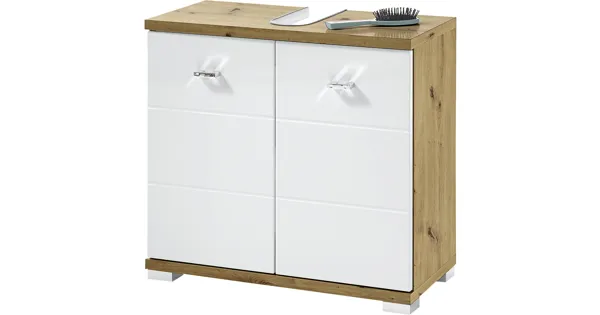 Verstaue deine Handtücher, Pflegeprodukte oder jegliches Badzubehör in unserem modernen Lavaboy Loop. Die zeitgemässe Kombination aus Betonoptik und Hochglanz macht das Möbel zum Hingucker im Badezimmer. Der Badunterschrank mit zwei Türen und silbernen Griffen bietet reichlich Stauraum. Unser Lavaboy Loop in Artisan Eiche und Hochglanzoptik in Weiss ist das passende Ergänzungsstück zum gleichfarbigen Badhochschrank Loop. Die Badserie Loop ist insgesamt in vier verschiedenen Ausführungen erhältlich.