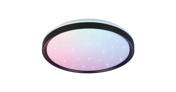 Die kreisförmige Deckenleuchte Solit verbindet reduziertes Design mit moderner Lichttechnik. Dank der Dynamic-Light-Funktion lassen sich individuelle Lichtstimmungen erzeugen, während die RGB-LEDs unabhängig voneinander, gemeinsam oder in Gruppen geschaltet werden können. Ob sanftes Stimmungslicht, lebendige Farbwechsel oder vorprogrammierte Effekte – Solit setzt in jedem Fall faszinierende Akzente. Helligkeit und Lichtfarbe sind bequem per Fernbedienung steuerbar. Ein besonderes Highlight ist das Cover mit stilvollem Starlight-Effekt, das dem Raum eine edle Note verleiht. Gefertigt aus schwarzem Kunststoff verbindet Solit modernes Design mit atmosphärischer Lichtkunst. Die integrierte LED-Technologie sorgt für eine hohe Lichtqualität und Energieeffizienz. Im Vergleich zu Halogenlampen lassen sich so bis zu 80 Prozent der Energiekosten sparen. LEDs sind langlebig, entwickeln weniger Wärme und schonen die Umwelt.