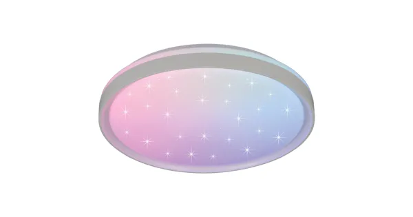 Die kreisförmige Deckenleuchte Solit verbindet reduziertes Design mit moderner Lichttechnik. Dank der Dynamic-Light-Funktion lassen sich individuelle Lichtstimmungen erzeugen, während die RGB-LEDs unabhängig voneinander, gemeinsam oder in Gruppen geschaltet werden können. Ob sanftes Stimmungslicht, lebendige Farbwechsel oder vorprogrammierte Effekte – Solit setzt in jedem Fall faszinierende Akzente. Helligkeit und Lichtfarbe sind bequem per Fernbedienung steuerbar. Ein besonderes Highlight ist das Cover mit stilvollem Starlight-Effekt, das dem Raum eine edle Note verleiht. Gefertigt aus mattweissem Kunststoff verbindet Solit modernes Design mit atmosphärischer Lichtkunst. Die integrierte LED-Technologie sorgt für eine hohe Lichtqualität und Energieeffizienz. Im Vergleich zu Halogenlampen lassen sich so bis zu 80 Prozent der Energiekosten sparen. LEDs sind langlebig, entwickeln weniger Wärme und schonen die Umwelt.