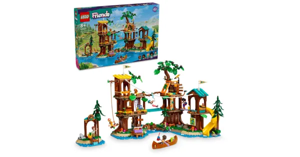 Das LEGO® Friends Baumhaus im Abenteuercamp (42631) ist ein Spielset, das Mädchen und Jungen ab 8 Jahren viele Campinggeschichten darstellen lässt. Kinder können die Freunde Leo, Aliya, Jamila und Olly unter Anleitung des Campbetreuers Jonathan aufregende neue Aktivitäten ausprobieren lassen. Viele coole Funktionen und Elemente lassen Kinder kreativ spielen. Das Bauset beinhaltet 5 Spielfiguren, Zubehör und einige Tiere, darunter auch 2 Biber, die einen Damm bauen. Lass die Figuren die Seilrutsche hinuntersausen oder hilf ihnen durch den Hindernisparcours mit Wackelbrücke, Kletterwand und Falltüren. Auch Aktivitäten wie das Kanufahren oder eine Insel, die per Boot oder Seilrutsche erreichbar ist, sind sehr verlockend!Dein junger Entdecker kann die Figuren auch Insekten suchen lassen. Werden sie alle Krabbeltiere entdecken und sich das Abzeichen verdienen? Halte nach dem putzigen Eichhörnchen Ausschau, das sich ein Versteck im Baumwipfel gebaut hat – mit Bett! Dieses Set ist eine tolle Geschenkidee für Mädchen und Jungen, die Spielzeugbaumhäuser lieben.