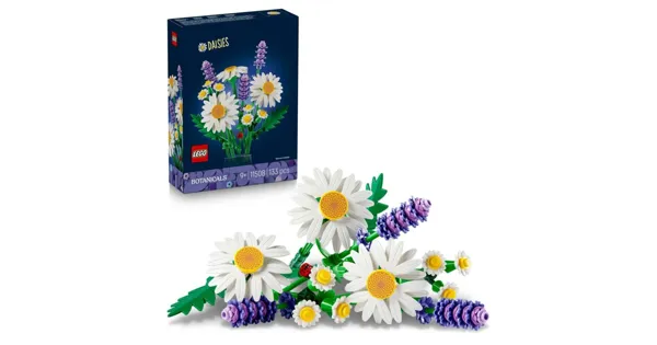 LEGO Botanicals Gänseblümchen (11508) ist ein Bauset, das Kinder ab 9 Jahren besonders fantasievoll spielen lässt.Kindern macht es grosse Freude, 3 grosse Gänseblümchen, 2 Stängel mit kleinen Gänseblümchen, 3 Lavendel und grüne Stängel zu bauen und zu einem süssen Strauss zusammenzufügen. Die LEGO Kunstblumen strahlen mit sehr natürlich wirkenden Blumen eine Mischung aus Heiterkeit und Ruhe aus. Und auch der bezaubernde Marienkäfer auf einem der Lavendelstängel wird junge Baufans bestimmt begeistern. Kinder können ihren fertigen LEGO Blumenstrauss dann im Zimmer ausstellen. Diese hübsche Blumendeko verwelkt nicht und muss auch nie gegossen werden.Diese LEGO Kunstblumen sind eine tolle Aufmerksamkeit zu besonderen Anlässen wie einem Geburtstag oder einer Einweihungsfeier und werden Blumenfans jeden Alters noch lange grosse Freude machen. Das Bastelset besteht aus 133 Teilen. Dasgrössere Gänseblümchen ist 20 cm hoch, und das kleinere Gänseblümchen ist 16 cm hoch.