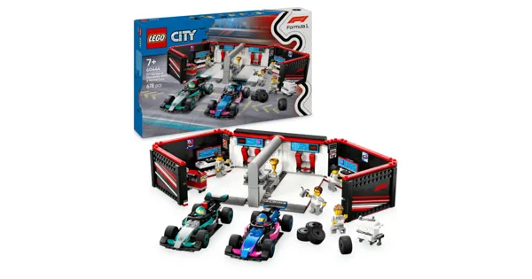 LEGO® City F1® Garage mit Mercedes-AMG & Alpine Rennautos (60444) schickt Kinder ab 7 Jahren in die faszinierende Welt der Formel 1® Rennen. Dieses Formel-1-Spielset zum Mitnehmen hat einen Tragegriff. Klappt man die Box auf, kommt eine Autowerkstatt mit Werkbänken, Werkzeug und fahrbaren Schweissgeräten sowie einem Turm mit Slicks zum Vorschein. Mithilfe eines Hebels können Kinder die F1-Rennautos aus den Startboxen losflitzen lassen. Auch 6 Minifiguren – 2 Rennfahrer und 4 Mechaniker – sowie ein Siegerpokal laden zu spannenden Rennen und Abenteuern auf der Rennstrecke ein.Zu diesem LEGO Formel-1-Modell ist eine digitale Anleitung in der LEGO Builder App verfügbar. In der App können Kinder 3D-Ansichten der Modelle vergrössern und drehen, beim Bauen ihren Baufortschritt verfolgen oder andere Spielsets erkunden und speichern.Dieses LEGO City F1 Spielset lässt Kinder den Nervenkitzel echterRennen erleben und ist ein tolles Weihnachts- oder Geburtstagsgeschenk für junge Motorsportfans. Entdecke noch weitere separat erhältlich LEGO F1 Bausets für Kinder und Erwachsene.