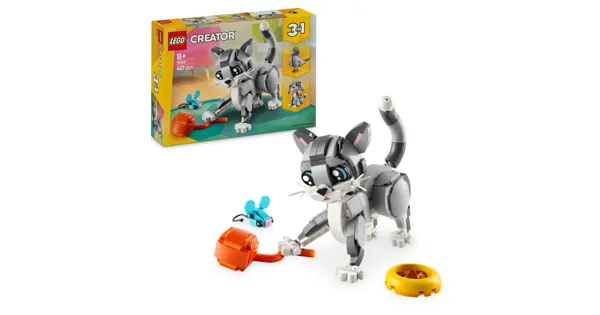 LEGO® Creator Graue Katze (31163) ist ein 3-in-1-Bauset für Tierfreunde ab 8 Jahren. Die niedliche Spielzeugkatze kann Kopf, Ohren, Schwanz und Beine bewegen. Ausserdem laden ein Napf, eine Spielzeugmaus und ein Garnknäuel Kinder dazu ein, unzählige lustige Tiergeschichten darzustellen.Mädchen und Jungen können 3 verschiedene LEGO Tiere aus denselben Steinen bauen: eine Spielzeugkatze, die sitzen, stehen und hüpfen kann, einen niedlichen Hund mit einem Knochen sowie eine Taube mit Brotkrümeln. Alle 3 Kulissen lassen Kinder fantasievoll spielen. Diese LEGO Modelle zum Spielen und Ausstellen sind ein tolles Geschenk.LEGO Creator 3-in-1-Sets wecken die Fantasie. Die Steine in jeder Box lassen Kinder 3 verschiedene Modelle mit grosser Begeisterung bauen und immer wieder umgestalten. Unsere breite Auswahl an 3-in-1-Sets spricht Kinder mit unterschiedlichsten Interessen an und umfasst unter anderem superschnelle Fahrzeuge, faszinierende Tiere und detailreiche Häuser. Wichtiger Hinweis: Die Modelle können nicht gleichzeitig gebaut werden.