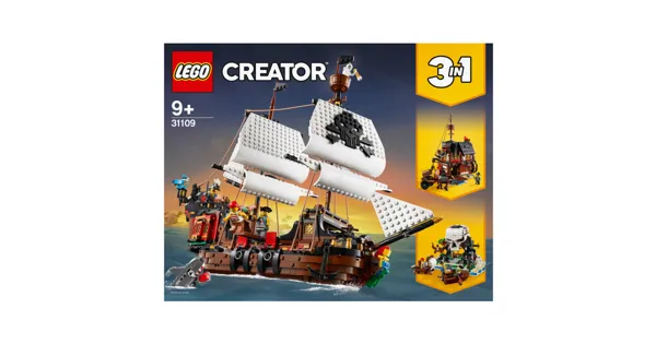 Ahoi! Setz die Segel und lichte den Anker, um mit dem fantastischen Piratenschiff in See zu stechen! Halte Ausschau nach Beute – der Frachtraum sieht nämlich ziemlich leer aus. Ahoi, Schiff voraus auf Steuerbord! Bring die Kanonen in Position und mach sie feuerbereit: Dieses Schiff sieht nach reicher Beute aus! Nach diesem Abenteuer baust du das Schiff in die Piratentaverne oder die geheimnisvolle Pirateninsel um. Dieses grossartige 3-in-1-Set kennt keine Flaute!