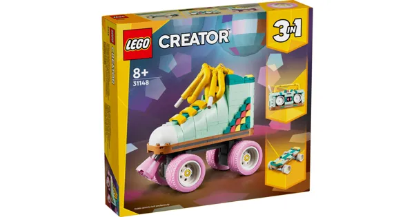 Kreative Kinder ab 8 Jahren können sich mit dem farbenfrohen LEGO® Creator Rollschuh (31148) auf eine Zeitreise in die Vergangenheit begeben. Das Bauset beinhaltet einen LEGO Rollschuh mit 4 rosafarbenen drehbaren Rädern, einem rosafarbenen Stopper und dicken gelben Schnürsenkeln. Auch diverse bunte Elemente liegen bei, damit dein Kind die Ferse des Schuhs mit eigenen Mustern verzieren kann.Dieses LEGO Creator 3-in-1-Set bietet Kindern 3 verschiedene Bau- und Spielerlebnisse mit denselben Steinen. Dein Kind kann zunächst einen Spielzeug-Rollschuh bauen und das Modell dann in ein buntes Mini-Skateboard im Retro-Look oder in eine Boombox mit kurzer Antenne verwandeln. Alle 3 Modelle sind spektakuläre Hingucker, die man nach dem Spielen im Kinderzimmer ausstellen kann.LEGO Creator 3-in-1-Spielzeuge sind tolle Geschenke für Kinder, denn mit den Steinen in jeder Box kann dein Kind 3 verschiedene Modelle bauen und mit grosser Begeisterung immer wieder umgestalten. 3-in-1-Sets bieten Kindern mit unterschiedlichsten Interessen stundenlanges Spielvergnügen mit einer breiten Auswahl an Modellen. Hierzu zählen rasante Fahrzeuge, faszinierende Tiere und detailreiche Stadtkulissen.
