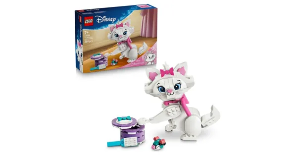 Mit dem LEGO | Disney Set Aristocats: Bezaubernde Marie (43286) entsteht eine süsse Katzenfigur aus LEGO Steinen, die nicht nur zum Spielen einlädt, sondern auch ein niedliches Highlight im Kinderzimmer ist. Die baubare Figur der beliebten Disney Katze Marie ist beweglich, ihr Kopf, Schwanz, Beine und Ohren lassen sich flexibel positionieren, sodass immer wieder neue Szenen dargestellt werden können. Zum LEGO Set gehören liebevoll gestaltete Zubehörelemente wie eine kleine Maus, eine Geschenkbox mit Deckel, eine Bürste, ein Fisch und eine rosafarbene Stoffschleife, die an der Figur befestigt werden kann. Das macht dieses kreative Bauspielzeug zu einem Erlebnis für kleine Tierfreunde. Kinder können Marie positionieren, Geschichten erfinden und dabei ganz nebenbei Feinmotorik, Fantasie und Konzentration trainieren.Mit 369 Teilen ist dieses Spielset ein wunderbares Geschenk für Kinder ab 7Jahren, die den Film Aristocats lieben oder einfach Spass an Tierfiguren, Disney Spielzeug und kreativem Bauen haben. Die LEGO Builder App begleitet den Aufbau mit 3D-Ansichten und digitalen Funktionen, für ein modernes und unterhaltsames Bauerlebnis mit Nostalgiecharme.