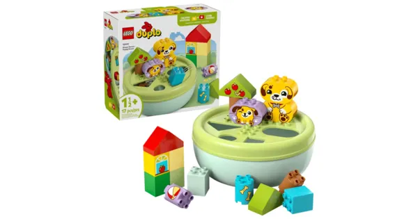 LEGO DUPLO Formsortierer: Welpenhaus (10441) ist ein tolles Lernspielzeug für Hundefans im Vorschulalter. Dieses Spielset lässt Kleinkinder ab 18 Monaten Fingerfertigkeit entwickeln. Wenn Kinder das Spielhaus aus LEGO Steinen für die Welpen bauen und die Formen durch die passenden Löcher im Deckel fallen lassen, können sie lernen, wie man Probleme löst, und unterschiedliche Formen erkennen. Dieses Geschenk bietet tolle Familienaktivitäten und bringt Vorschulkindern ab 1,5 Jahren räumliches Denken bei. Eltern können all die unterschiedlich geformten Steine zeigen und ihr Kleinkind dann Bäume, Hundefiguren und sogar ein Haus damit bauen lassen. Kinder dürfen sich auf kreative Rollenspiele mit ihren niedlichen LEGO DUPLO Spielzeug Hunden freuen und die Welpen einem Ball hinterherjagen oder an einem Knochen knabbern lassen. Nach dem fantasievollen Spielerlebnis können Kinder die Formen sortieren. Beim Heraustüfteln, welche Form in welches Loch passt, müssen sich Kleinkinder konzentrieren und Geduld und Hartnäckigkeit entwickeln. Wenn sie es nicht gleich richtig hinbekommen, müssen sie erneut versuchen, das passende Loch für das jeweilige Spielzeug zu finden. Das Babyspielzeug hilft Kindern auch ihre Hand-Augen-Koordination zu verbessern.