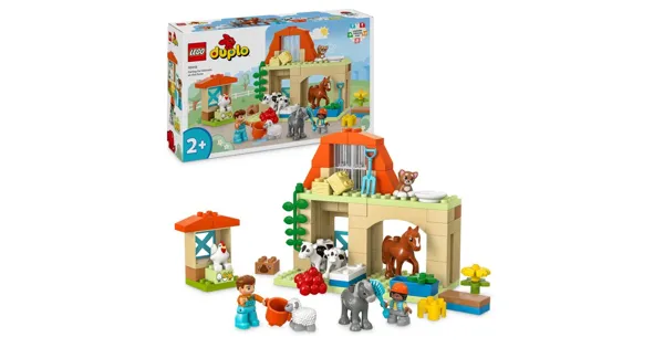 Kennst du ein Kleinkind, das Bauernhof-Spielsets liebt? Tierpflege auf dem Bauernhof (10416) ist das perfekte Geschenk für ganz junge Tierfreunde. Dieses Lernspielzeug für Kleinkinder ab 2 Jahren beinhaltet 8 LEGO® DUPLO® Tierfiguren – unter anderem ein Pferd, ein Schaf, eine Kuh und Hühner–, die jedes Kleinkind begeistern, das Spielzeuge zum Nachstellen des echten Lebens liebt, und das gern neue Freunde auf dem Bauernhof findet.Dieser Spielzeug-Bauernhof strotzt vor entwicklungsfördernden Funktionen. Eltern können ihrem Vorschulkind zeigen, wie man Tiere füttert und versorgt. Der Bauer hilft seinem Kind im Bauernhof beim Waschen der Äpfel, die an die Kuh und ihr Kalb verfüttert werden sollen. Im Hühnerstall kümmert sich die Henne um ihre Küken. Kleinkinder können auch so tun, als würden sie auf dem Pferd reiten und es dann im Stall mit Heu füttern.Dieses Lernspielzeug beinhaltet bunte und besonders faszinierende Steine und Teile, die Kleinkinder gern erkunden und zusammenstecken. Beim und Spielen entwickeln Kinder Fingerfertigkeit und die Fähigkeit, Probleme zu lösen.