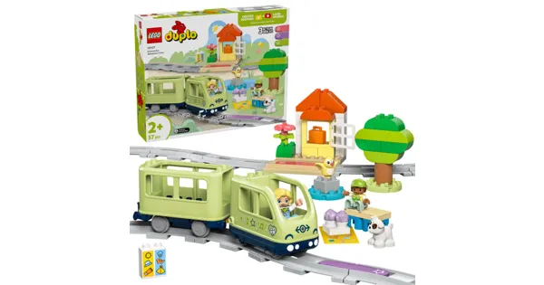 Die Interaktive Abenteuer-Eisenbahn (10427) ist ein Spielzeug für Vorschulkinder, das Kleinkinder ab 2 Jahren zum Lokführer macht. Diese Spielzeugeisenbahn lässt Kleinkinder das Ziel für den Familienausflug auswählen und auf eine lehrreiche Reise mit vielen Lichtern und Geräuschen gehen. Dieses Spielset zum Bauen und Umbauen beinhaltet diverse Steine, um einen Park, einen Strand, einen Bahnhof oder ein Einfamilienhaus zu bauen, weckt die Neugier von Kleinkindern und bringt ihnen kreative Bautechniken bei. Das Lernspielzeug lässt Vorschulkinder Geduld, Fingerfertigkeit und Kreativität entwickeln, wenn sie sich aufs Bauen der Bahnstrecke konzentrieren und ein Ziel für den Zug auswählen.3 Aktionssteine sorgen für ein lebhaftes Spielerlebnis und lassen den Zug wirklichkeitsnahe Geräusche machen, wenn er über sie hinwegrollt. So lernen Kleinkinder, Vorhersagen zu treffen, wenn sie raten, welches Geräusch der Zug wohl gleich machen wird. Sie können auch den speziell anpassbaren Stein verwenden, um eigene Geräusche abzuspielen, die sie mit LEGO® DUPLO® Interactive Trains aufgenommen haben. Diese kostenlose App verwandelt ein Smartphone oder Tablet in eine Fernsteuerung für den Zug.