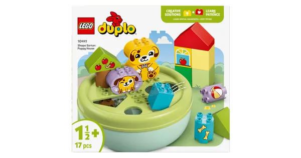 LEGO DUPLO Formsortierer: Welpenhaus (10441) ist ein tolles Lernspielzeug für Hundefans im Vorschulalter. Dieses Spielset lässt Kleinkinder ab 18 Monaten Fingerfertigkeit entwickeln. Wenn Kinder das Spielhaus aus LEGO Steinen für die Welpen bauen und die Formen durch die passenden Löcher im Deckel fallen lassen, können sie lernen, wie man Probleme löst, und unterschiedliche Formen erkennen. Dieses Geschenk bietet tolle Familienaktivitäten und bringt Vorschulkindern ab 1,5 Jahren räumliches Denken bei. Eltern können all die unterschiedlich geformten Steine zeigen und ihr Kleinkind dann Bäume, Hundefiguren und sogar ein Haus damit bauen lassen. Kinder dürfen sich auf kreative Rollenspiele mit ihren niedlichen LEGO DUPLO Spielzeug Hunden freuen und die Welpen einem Ball hinterherjagen oder an einem Knochen knabbern lassen. Nach dem fantasievollen Spielerlebnis können Kinder die Formen sortieren. Beim Heraustüfteln, welche Form in welches Loch passt, müssen sich Kleinkinder konzentrieren und Geduld und Hartnäckigkeit entwickeln. Wenn sie es nicht gleich richtig hinbekommen, müssen sie erneut versuchen, das passende Loch für das jeweilige Spielzeug zu finden. Das Babyspielzeug hilft Kindern auch ihre Hand-Augen-Koordination zu verbessern.