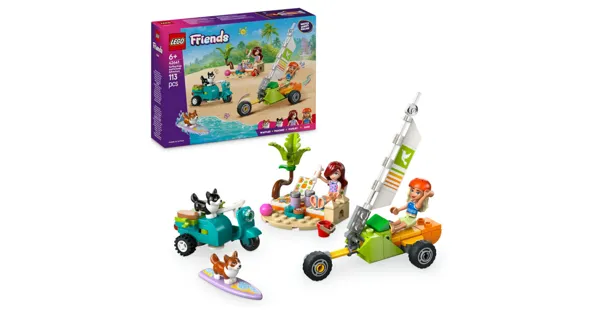 LEGO® Friends Strandabenteuer mit Hunden (42641) ist ein Bauspielzeug für Rollenspiele, mit dem Mädchen, Jungen und kleine Tierfreunde ab 6 Jahren viele eigene Strandabenteuer darstellen können. Das Set beinhaltet ein Mini-Surfbrett, einen Motorroller, einen Strandsegler und Liegestühle. Ausserdem laden 2 LEGO Friends Spielfiguren und 2 Corgis zu kreativen Geschichten ein. Das Set ist eine tolle Geschenkidee für Kinder, die gern fantasievoll spielen.Begleite Sage und Paisley mit ihren Corgis zum Spielen an den Strand. Die Freundinnen ruhen sich auf ihren Liegestühlen aus, während sich die Hunde auf dem Surfbrett abwechseln. Dann ist es höchste Zeit, mal eine Runde mit dem Motorroller oder dem Strandsegler zu drehen. Auf beiden Fahrzeugen kann man auch einen Hund mitnehmen!Entdecke im LEGO Friends Universum noch weitere separat erhältliche Geschenkideen für Kinder. Zu dem Set ist auch dieLEGO Builder App für ein intuitives Bauerlebnis verfügbar. In der App können Kinder beim Bauen 3D-Ansichten der Modelle vergrössern und drehen, Sets speichern und den Baufortschritt verfolgen.