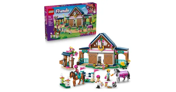 Mach dich bereit für spannende Reitabenteuer mit dem LEGO Friends Pferdestall und Reitschule (42688), ein schön gestaltetes Bauernhof Spielzeug für Mädchen und Jungen ab 7 Jahren. Dieses detailreiche LEGO Reiterhof lässt Kinder in den Alltag eines Reitstalls eintauchen: mit Liann, Aliya und der Reitlehrerin Cindy erleben sie Reitstunden, versorgen die Tiere und meistern viele spannende Aufgaben rund um den Hof. Das Spielset enthält zwei Pferde, die mit einer Satteldecke ausgerüstet werden können. Kinder können mit den Tieren über Hindernisse springen, sie füttern, mit Heu versorgen oder den Stall ausmisten. Nach dem aktiven Tag wartet ein gemütlicher Schlafbereich über dem Stall! Viele Zubehörteile wie Karotten, Bücher, Pokale, ein Whiteboard und Stallwerkzeuge sorgen für abwechslungsreiche Geschichten bei jedem Spiel.Dieses Spielset ist ein fantastisches Geschenk für Mädchen ab 7 Jahren, die sich für Pferde Spielzeug begeistern. Dieser Hof steckt voller Spielideen für alle kleinen Pferdefreunde. Mit der kostenlosen LEGO Builder App können Kinder das Modell in 3D drehen, zoomen und ihren Baufortschritt verfolgen. Enthält 735 Teile.