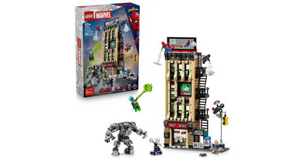 Spider-Man vs. Mysterio: Daily Bugle (76342) lässt Kinder ab 10 Jahren ein actiongeladenes Hochhaus-Abenteuer erleben. Dieses LEGO Marvel Konstruktionsspielzeug bietet auf 4 Etagen jede Menge Action und Details für spannende Rollenspiele. Das Spider Man Spielzeug ist ein tolles Geschenk für Jungen und Mädchen, die in die Welt der Superhelden eintauchen möchten.Das Set enthält mehrere LEGO Marvel Figuren, darunter Spider-Man, Miles Morales, Ghost Spider, J. Jonah Jameson, Mysterio, Venomized Captain America und Rhino. Der Rhino-Mech ist beweglich und besitzt ein aufklappbares Cockpit. Im Inneren des Daily Bugle LEGO Sets befinden sich Büros, ein Nachrichtenstudio, ein Bargeldtresor und viele weitere Szenen zum Nachspielen. Für noch mehr Dynamik sorgen transparente Aufkleber und Steine, mit denen Kinder schwebende Figuren darstellen können.Auch aussen gibt es viel zu entdecken: eine Feuertreppe, einen Zeitungsstand und eine Strassenecke mit Ampel machen das Gebäude lebendig. Dieses LEGO Spider Man Set ist ein cooles Superhelden Spielzeug und ein tolles Spielzeug für Jungen ab 10 Jahren. Die digitale Anleitung in der LEGO Builder App bietet 3D-Ansichten, Zoom-Funktionen und zeigt den Baufortschritt an. Das Spielset besteht aus 781 Teilen.