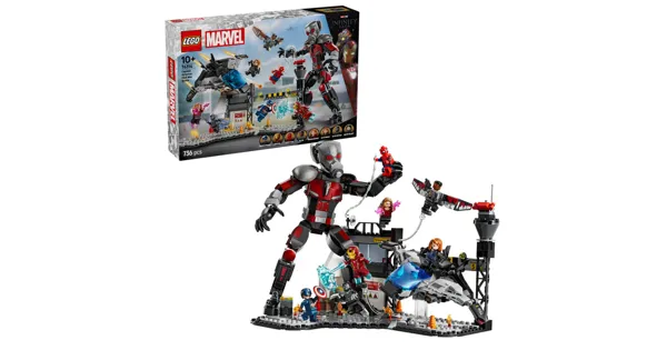 Captain America: Civil War Actionduell (76314) ist ein detailreiches LEGO® Marvel Bauspielzeug. Das Set ist ein fantastisches Superheldengeschenk für Kinder ab 10 Jahren. 9 LEGO Marvel Figuren, ein Quinjet und jede Menge Zubehörelemente lassen Kinder mit diesem LEGO Bauset ihre Lieblingsfilmszenen nachstellen und unzählige weitere fantasievolle Abenteuer darstellen. Darüber hinaus bietet das Modell aber auch unzählige Ausstellungsmöglichkeiten.Dieses Bau- und Spielset basiert auf dem Showdown am Flughafen aus dem Film Captain America: Civil War aus den Marvel Studios. Das Set beinhaltet 8 Minifiguren – Captain America, Winter Soldier, Wanda, Falcon, Iron Man, Spider-Man, Black Widow und Black Panther – mit passender Ausrüstung sowie Ant-Man. Die voll bewegliche Actionfigur ist 24 cm gross. Der Quinjet hat einklappbare Flügel und ein aufklappbares Minifigur-Cockpit für den Piloten. Ein explodierendes Fass auf dem Flughafengelände bietet zusätzlichen Actionspass. Und in der LEGO Builder App können Kinder beim Bauen digitale Modellansichten vergrössern und drehen.