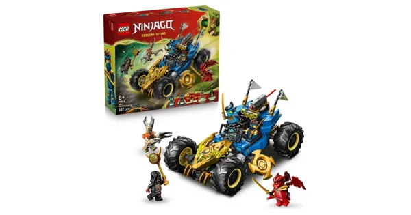 LEGO NINJAGO Jays Transformationsflitzer (71856) ist ein spannendes LEGO Set, das Kindern ab 8 Jahren viele Stunden Actionspass und kreatives Spielen ermöglicht. Dieses wandelbare Modellbau Set lässt sich als 2-in-1-Ninja-Spielzeugauto bauen und ausstellen. Mit nur wenigen Handgriffen wird die Front des Fahrzeugs umgeklappt, schon verwandelt es sich in den Drachenmodus mit goldenen Klauen, einem LEGO NINJAGO Drachenkopf und rotierenden Wurfsternen.Das vielseitige Kinderspielzeug bietet unzählige Spielmöglichkeiten: Der abnehmbare Shooter kann auf das pflanzenbedeckte Nebenmodell gesetzt werden, für noch mehr spannende Duelle. Mit dabei sind 5 Minifiguren aus der Welt von NINJAGO: Jay, Nya, Drachen-Form-Kai, das Erdmonster und der Loyalistenanführer, bereit für epische Kämpfe zwischen Gut und Böse.Dieses Kinder Spielzeug bringt die TV-Serie „Aufstieg der Drachen“ direkt ins Kinderzimmer. Mit der LEGO Builder App wird das Bauen zum Kinderspiel: 3D-Modelle vergrössern, drehen und Fortschritte speichern. Ein grossartiges Geschenk für Jungen und Mädchen, die Spielzeug lieben und in die Welt der Ninjas eintauchen wollen. Das Bauset besteht aus 387 Teilen.