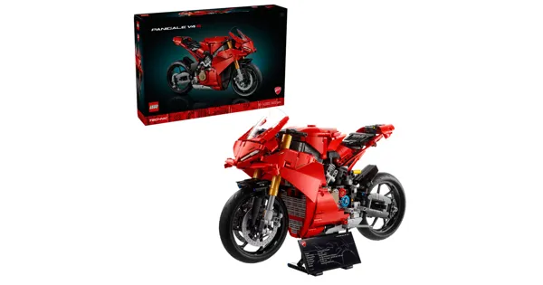 Das LEGO® Technic Ducati Panigale V4 S Motorrad (42202) aus diesem Bauset für Erwachsene beschert dir auf jeden Fall einen höheren Puls. Dank der imposanten Details und der authentischen Funktion ist dieses Modell eine tolle Hommage an die echte Ducati Panigale V4 S – das leistungsstärkste und schnellste Rennmotorrad aus dem Ducati-Stall. Erkunde die Vorder- und Hinterradaufhängung sowie die Lenkung. Schau dir das Schaltpedal und das Schaltgetriebe (3 Gänge und Neutral) an. Dreh das Hinterrad, um die Kette anzutreiben, die das Schaltgetriebe mit dem V4-Motor verbindet. Die Lackierung im legendären Ducati-Rot macht dieses Modell zur perfekten Geschenkidee für Motorradfans. Auf dem beiliegenden Ständer wird das Superbike zu einem spektakulären Hingucker. Die Kollektion der LEGO Technic Fahrzeuge für Erwachsene lässt dich deine Begeisterung für superleistungsstarke Flitzer voll ausleben und bietet dir zugleich ein entspannendes Bauerlebnis. Eine Bauanleitung liegt dem Set bei. Eine digitale Version dieser Bauanleitung ist ausserdem in der LEGO Builder App verfügbar.