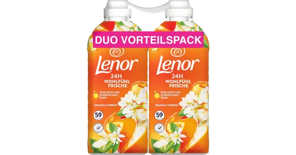 Erlebe mit dem Lenor Weichspüler Orange & Verbene ein neues Frischegefühl, das deinen Alltag bereichert! Die Kombination aus ätherischen Ölen und dem belebenden Duft von Orange & Verbene sorgt für langanhaltende Wohlfühlfrische – selbst bei kurzen und kalten Waschgängen. Dein Vorteil: Mit diesem Duo-Vorteilspack erhältst du insgesamt 118 Waschgänge, die deine Wäsche zuverlässig weich und angenehm duftend machen.