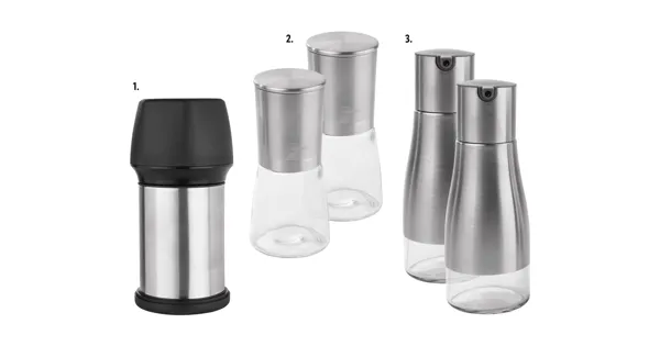 , Mit 2 Arten von Edelstahl-Raspelscheiben für feine Flocken und Scheiben , Stufenlose Mahleinstellung von grob bis fein; Nutzvolumen: je 140 ml , Nutzvolumen: je 300 ml , Pro Stück/Set