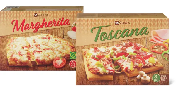 Tiefgekühlt, in Sonderpackungen, z.B. Toscana, 3 Stück, 1080 g, 8.85 statt 11.85, 100 g = 0.82, Angebot gilt nur vom 2.4. bis 8.4.2026, solange Vorrat.