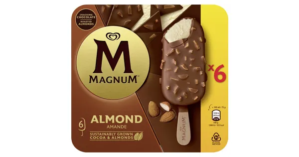 Vanilleeis umhüllt von Milchschokolade (30%) mit Mandeln (4,5%) Das Magnum Almond ist ein Genuss für alle Eisliebhaber. Die Kombination aus cremigem Vanilleeis und knackigen Mandelstücken, umhüllt von feinster Schokolade, macht dieses Produkt der Marke Magnum zu einem unwiderstehlichen Geschmackserlebnis. Geniessen Sie die hohe Produktqualität, die Magnum verspricht. – Zutaten: Entrahmte MILCH, Zucker, Trinkwasser, Kakaobutter¹, Kokosfett, MAGERMILCHPULVER, MANDELN, Glukosesirup, BUTTERFETT, Glukose-Fruktose-Sirup, Kakaomasse¹, MOLKENERZEUGNIS, Emulgatoren (E471, Lecithine), Stabilisatoren (Guarkernmehl, Johannisbrotkernmehl, Tarakernmehl, Carrageen), vermahlene Vanilleschoten, natürliches Vanillearoma¹ (mit MILCH), natürliches Vanillearoma, Farbstoff (Carotin). Kann andere Nüsse enthalten.¹Rainforest Alliance-zertifiziert. Zutaten: Entrahmte MILCH, Zucker, Trinkwasser, Kakaobutter¹, Kokosfett, MAGERMILCHPULVER, MANDELN, Glukosesirup, BUTTERFETT, Glukose-Fruktose-Sirup, Kakaomasse¹, MOLKENERZEUGNIS, Emulgatoren (E471, Lecithine), Stabilisatoren (Guarkernmehl, Johannisbrotkernmehl, Tarakernmehl, Carrageen), vermahlene Vanilleschoten, natürliches Vanillearoma¹ (mit MILCH), natürliches Vanillearoma, Farbstoff (Carotin). Kann andere Nüsse enthalten.¹Rainforest Alliance-zertifiziert.