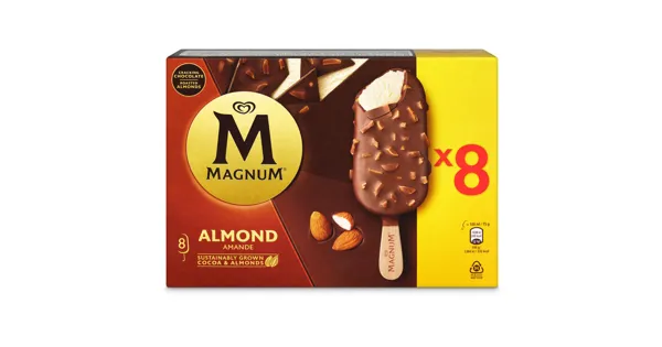 Vanilleeis umhüllt von Milchschokolade (30%) mit Mandeln (4,5%) – Zutaten: Entrahmte MILCH, Zucker, Trinkwasser, Kakaobutter¹, Kokosfett, MAGERMILCHPULVER, MANDELN, Glukosesirup, BUTTERFETT,...