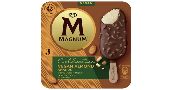 Vanillespeiseeis auf pflanzlicher Basis und Schokoladenkuvertüre (31%) mit Mandeln (5%). Schokoladenkuvertüre enthält neben Kakaobutter auch andere pflanzliche Fette Magnum Vegan Almond ist ein...