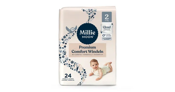 Windeln, die so weich sind, dass sie sich wie eine Wolke anfühlen. Millie Moon Premium Comfort Windeln bieten CloudTouch™-Weichheit für höchsten Komfort. Das federweiche Innenvlies nimmt Feuchtigkeit sofort auf, damit die Haut trocken bleibt und das Risiko von Hautreizungen reduziert wird. Die Premium Comfort Windeln sind dermatologisch getestet und besonders hautverträglich. Der ultra saugfähige Kern, doppelte Auslaufschutz und das hohe, elastische Rückenbündchen bieten bis zu 12 Stunden Auslaufschutz.* Frei von Duftstoffen, Lotionen und Latex. *Die tatsächliche Dauer hängt von der individuellen Urinmenge und den Blasengewohnheiten des Babys ab. - CloudTouch™-Weichheit für ultimativen Komfort - Bis zu 12 Stunden Saugkraft - Hypoallergen und dermatologisch getestet - Frei von Lotionen, Latex und Duftstoffen - Praktischer Nässeindikator - Hohes, elastisches Rückenbündchen für optimalen Sitz - Sichere Verschlussstreifen - PETA-zertifiziert, vegan & tierversuchsfrei - OEKO-Tex Standard 100