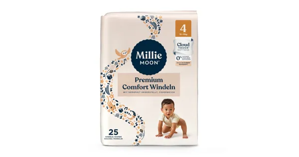 Windeln, die so weich sind, dass sie sich wie eine Wolke anfühlen. Millie Moon Premium Comfort Windeln bieten CloudTouch™-Weichheit für höchsten Komfort. Das federweiche Innenvlies nimmt Feuchtigkeit sofort auf, damit die Haut trocken bleibt und das Risiko von Hautreizungen reduziert wird. Die Premium Comfort Windeln sind dermatologisch getestet und besonders hautverträglich. Der ultra saugfähige Kern, doppelte Auslaufschutz und das hohe, elastische Rückenbündchen bieten bis zu 12 Stunden Auslaufschutz.* Frei von Duftstoffen, Lotionen und Latex. *Die tatsächliche Dauer hängt von der individuellen Urinmenge und den Blasengewohnheiten des Babys ab. - CloudTouch™-Weichheit für ultimativen Komfort - Bis zu 12 Stunden Saugkraft - Hypoallergen und dermatologisch getestet - Frei von Lotionen, Latex und Duftstoffen - Praktischer Nässeindikator - Hohes, elastisches Rückenbündchen für optimalen Sitz - Sichere Verschlussstreifen - PETA-zertifiziert, vegan & tierversuchsfrei - OEKO-Tex Standard 100