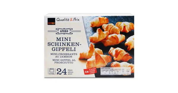 Blätterteiggebäck mit 35% Füllung aus Schinken, Schweine- und Rindfleischerzeugnis Die Mini Schinkengipfeli von Qualité&Prix sind eine ideale Wahl für einen schnellen Snack oder als Beilage zu Ihrer Mahlzeit. Sie sind tiefgekühlt und somit einfach und praktisch zu lagern. Mit ihrem guten Preis-Leistungsverhältnis bieten sie eine kostengünstige Option für jeden Haushalt. – Zutaten: WEIZENMEHL, Wasser, Hinterschinken 17% (Schweinefleisch [Schweiz], Nitritpökelsalz [Kochsalz, Konservierungsstoff [E 250]], Maltodextrin, Glucosesirup, Stabilisatoren [E 450, E 451], Antioxidationsmittel [E 301], Gewürzextrakt), pflanzliche Öle (Raps, Raps ganz gehärtet, Sonnenblumen), EIER*, Fleischkäsebrät (Schweinefleisch [Schweiz], Speck [Schweiz], Eis, Rindfleisch [Schweiz], Nitritpökelsalz [Kochsalz, Konservierungsstoff [E 250]], Gewürze, Stabilisatoren [E 450, E 262], Glucose, Würze, Antioxidationsmittel [E 300, E 301], Gewürzextrakt), EIWEISS*, Olivenöl, SENF, Kochsalz jodiert, Rinderbouillon (Kochsalz, natürliches Aroma, Champignonsaftkonzentrat, Maltodextrin, Karottensaftkonzentrat, Rinderfett, Zwiebelpulver, Rindfleischextrakt, Zucker, Knoblauchpulver, Stärke, karamellisierter Zucker, Zitronensaftpulver), Emulgator (E 471), MAGERMILCHPULVER, MOLKENPULVER, Säuerungsmittel (E 330), GERSTENMALZMEHL, Streuwürze, Glucose, Antioxidationsmittel (E 392). * aus Freilandhaltung. Zutaten: WEIZENMEHL, Wasser, Hinterschinken 17% (Schweinefleisch [Schweiz], Nitritpökelsalz [Kochsalz, Konservierungsstoff [E 250]], Maltodextrin, Glucosesirup, Stabilisatoren [E 450, E 451], Antioxidationsmittel [E 301], Gewürzextrakt), pflanzliche Öle (Raps, Raps ganz gehärtet, Sonnenblumen), EIER*, Fleischkäsebrät (Schweinefleisch [Schweiz], Speck [Schweiz], Eis, Rindfleisch [Schweiz], Nitritpökelsalz [Kochsalz, Konservierungsstoff [E 250]], Gewürze, Stabilisatoren [E 450, E 262], Glucose, Würze, Antioxidationsmittel [E 300, E 301], Gewürzextrakt), EIWEISS*, Olivenöl, SENF, Kochsalz jodiert, Rinderbouillon (Kochsalz, natürliches Aroma, Champignonsaftkonzentrat, Maltodextrin, Karottensaftkonzentrat, Rinderfett, Zwiebelpulver, Rindfleischextrakt, Zucker, Knoblauchpulver, Stärke, karamellisierter Zucker, Zitronensaftpulver), Emulgator (E 471), MAGERMILCHPULVER, MOLKENPULVER, Säuerungsmittel (E 330), GERSTENMALZMEHL, Streuwürze, Glucose, Antioxidationsmittel (E 392). * aus Freilandhaltung.