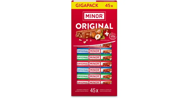Schokoladen-Confiserie mit gerösteten Haselnuss-Splittern Minor - Ein Stück Glück. – Zutaten: Zucker, HASELNÜSSE 24%, Kakaobutter, MAGERMILCHPULVER, MANDELN, Kakaomasse, SOJAMEHL, Emulgator...
