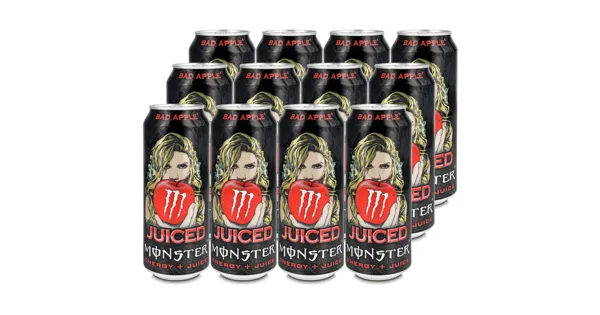 Energy-Drink mit 6% Fruchtsaft aus Fruchtsaftkonzentraten, Taurin, Inosit und B-Vitaminen. Mit Zuckern und Süssungsmittel. Kohlensäurehaltig Der Monster Juice Bad Apple vereint erfrischende Apfelnote mit der kraftvollen Energie eines klassischen Energy Drinks. Ein spritziges Geschmackserlebnis in einer stilvollen Verpackung, das wach macht und belebt. Perfekt für alle, die ein aromatisches Getränk mit einem Hauch von Apfel suchen. – Zutaten: Wasser, Zucker, 6% Fruchtsaft aus Fruchtsaftkonzentraten (Apfel [4.7%], Birne, Kiwi, Sauerkirsche), Glukosesirup, Säuerungsmittel (Citronensäure, Apfelsäure), Kohlensäure, Taurin (400mg/100ml), Säureregulator (Natriumcitrate), Aromastoff Panax Ginseng Wurzelextrakt (85mg/100ml), Aroma, Verdickungsmittel (Pektine), Farbstoffe (E150d, E101), Konservierungsstoffe (Kaliumsorbat), Koffein (32mg/100ml), pflanzliche Öle (Kokosnuss, Rapssamen), modifizierte Stärke, Vitaminmischung (Niacin, Vitamin B6, Vitamin B12), schwarzes Karottensaftkonzentrat, Süssungsmittel (Sucralose), Natriumchlorid, Guaranasamenextrakt (2mg/100ml), Inosit (2mg/100ml). Zutaten: Wasser, Zucker, 6% Fruchtsaft aus Fruchtsaftkonzentraten (Apfel [4.7%], Birne, Kiwi, Sauerkirsche), Glukosesirup, Säuerungsmittel (Citronensäure, Apfelsäure), Kohlensäure, Taurin (400mg/100ml), Säureregulator (Natriumcitrate), Aromastoff Panax Ginseng Wurzelextrakt (85mg/100ml), Aroma, Verdickungsmittel (Pektine), Farbstoffe (E150d, E101), Konservierungsstoffe (Kaliumsorbat), Koffein (32mg/100ml), pflanzliche Öle (Kokosnuss, Rapssamen), modifizierte Stärke, Vitaminmischung (Niacin, Vitamin B6, Vitamin B12), schwarzes Karottensaftkonzentrat, Süssungsmittel (Sucralose), Natriumchlorid, Guaranasamenextrakt (2mg/100ml), Inosit (2mg/100ml).