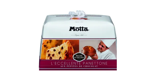 Hefegebäck Panettone mit Schokotropfen – Zutaten: WEIZENMEHL, EIER, Zucker, BUTTER (13,7%) (MILCH), Bitterschokotropfen (13,3%) (Zucker, Kakaomasse, Kakaobutter, Emulgator: SOJAlecithin;...