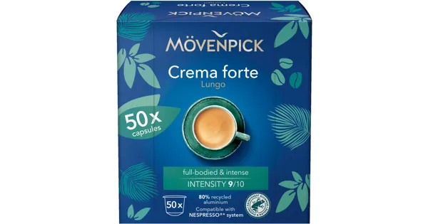 Entdecke mit Mövenpick Lungo Crema Forte deinen neuen Lieblingskaffee. Mit einer Intensität von 9/10 bietet dir jede Tasse ein vollmundiges und reichhaltiges Geschmackserlebnis, das du lieben wirst. Die hochwertigen Kapseln enthalten 100% sorgfältig gerösteten Mahlkaffee, der jeden Morgen zu einem besonderen Moment macht. Erlebe den Unterschied: Die Kapseln sind kompatibel mit deinem Nespresso-System, und die umweltschonende Verpackung besteht zu 80% aus recyceltem Aluminium.