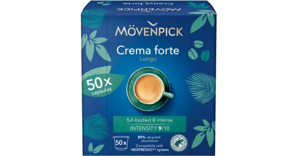 Entdecke mit Mövenpick Lungo Crema Forte deinen neuen Lieblingskaffee. Mit einer Intensität von 9/10 bietet dir jede Tasse ein vollmundiges und reichhaltiges Geschmackserlebnis, das du lieben wirst. Die hochwertigen Kapseln enthalten 100% sorgfältig gerösteten Mahlkaffee, der jeden Morgen zu einem besonderen Moment macht. Erlebe den Unterschied: Die Kapseln sind kompatibel mit deinem Nespresso-System, und die umweltschonende Verpackung besteht zu 80% aus recyceltem Aluminium.