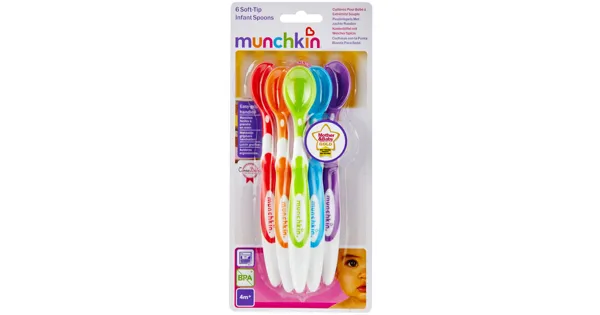 Kinderlöffel mit Weicher Spitze Munchkin 6 Löffel für Babys 3m+. Leicht greifbar. Das sollten Sie wissen: - Bunte Farben erregen die Aufmerksamkeit des Babys. - Abgerundete, weiche Spitzen sind sanft zum Zahnfleisch des Babys. - Ergonomischer Griff ist bequem zu halten. - Langer Stiel reicht in Gläschen mit Babykost bis ganz nach unten.