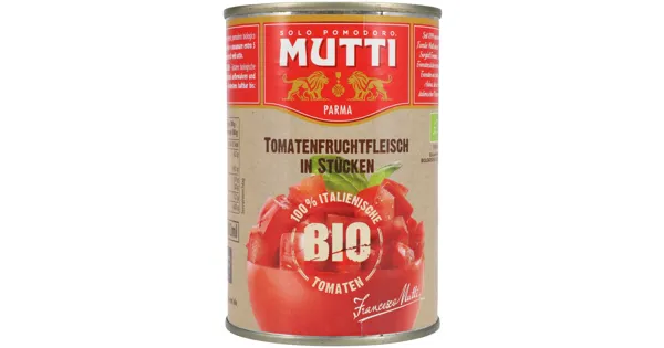 Bio-Tomatenfruchtfleisch, in Stücke geschnitten Die Mutti Bio Polpa ist eine gehackte Tomatenmischung in Bio-Qualität, ideal für vielseitige und schnelle Gerichte. Sie enthält ausschliesslich sonnengereifte Tomaten, die sorgfältig verarbeitet werden. Perfekt für eine aromatische Tomatensauce oder als Basis für diverse Rezepte. – Zutaten: Biologische Tomaten. Zutaten: Biologische Tomaten.