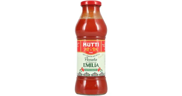 Passierte Tomaten Die hervorragenden Qualitätsmerkmale der Passata von Tomaten aus Emilia Mutti sind auf die verwendete Tomatensorte zurückzuführen: Die kleinen Datteltomaten mit der typisch länglichen Form wachsen in den Hügeln von Parma in der Emilia-Region. Die Passatavon Tomaten aus Emilia Mutti hat einen süssen Geschmack eine dickflüssige Konsistenz und eine leuchtend rote Farbe. Sie wird ausden tief roten und besonders reifen Tomaten hergestellt, die im Hochsommer geerntet werden. – Zutaten: Datteltomate 99,8%, Salz. Zutaten: Datteltomate 99,8%, Salz.