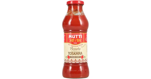 Passierte Tomaten Die spezifische Eigenschaften der Passata von Tomaten aus Toskana Mutti sind stammen von der verwendeten Tomatensorte, die speziDie Passata von Tomaten aus Toskana Mutti hat einen...